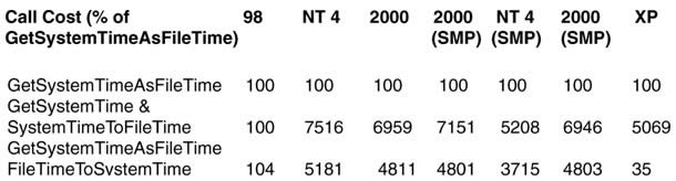 Table 6 Call cost of system time functions (as percentage of GetSystemTimeAsFileTime())